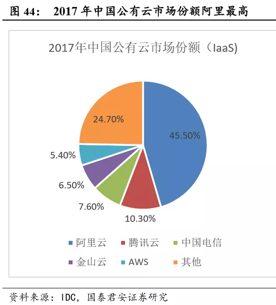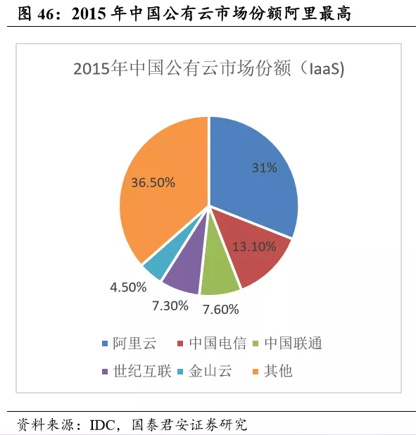 从市占率变化趋势来看,马太效应显著,在未来会持续增强。从全球市 占率来看,头部其他厂商市占率逐年增强,由2015 年的 51.83%增至2017年的 74.97%。这一趋势在中国公有云市场也得到体现,从 2015 年的63.5% 增至2017年的75.3%。我们认为,中国公有云市场格局初定,市占份额将持续向头部企业集中。