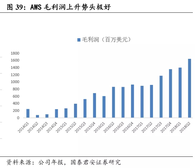亚马逊产业结构优化,云计算业务“最赚钱”。亚马逊长期以来将大量 的利润用于研发和产品创新,其创造的“亚马逊模式“已经获得市场的认可,公司投入较多的费用,使得公司整体利润率保持较低水平,2018 年上半年公司营业收入 1039.28 亿美元,毛利润 49.11 亿美元。AWS 业务在亚马逊公司内的营业收入占比不高,但却贡献了很高的毛利润。2018 年上半年 AWS 业务营业收入 115.47 亿美元,仅占公司整体营业收 入的 11.11%,毛利润为 30.43 亿美元,占公司整体毛利润的 61.96%。相 比于北美同时期 3.74%的电商行业利润率,2017 年亚马逊利润率高达 25.73%。从毛利润增长来看,亚马逊 AWS 业务毛利润呈稳步上升的趋势。2014 年以来,AWS 利润率增长速度远超公司零售业务增长速度, 受益于全球云计算市场规模不断扩大,预计在未来 AWS 业务规模可能 会超过其零售业务,为亚马逊带来更为广阔的成长和盈利空间。