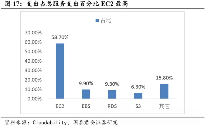 Cloudability数据显示,虽然AWS有成百上千个产品,但最主要的支出还是在 EC2(云主机)、EBS(块存储)、RDS(数据库)和 S3(对象存储)这四项,EC2 贡献了 58.7%,EBS 贡献了 9.9%,RDS 贡献了 9.3%,S3贡献了 6.3%,这四项占总服务支出的 85%。