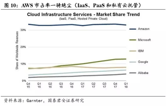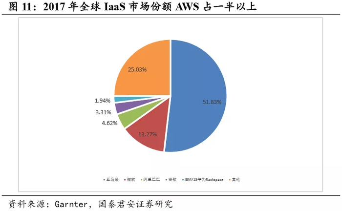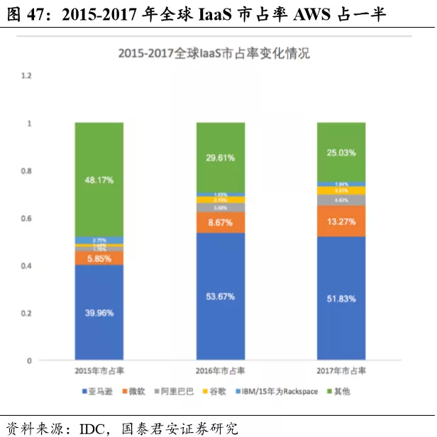 从公有云业务来看,截至 2018 年Q1,以IaaS 和PaaS 销售额为基准, Synergy数据显示全球厂商前五分别是AWS、微软、谷歌、阿里云和IBM, 五大供应商控制着公有云近四分之三的市场,市场集中度较高,马太效 应进一步凸显。截至 2018 年第一季度,AWS 全球市场份额在 12 个季度 内稳定在 33%左右,是排名第二的微软 Azure 三倍左右。随着云计算的 蓬勃发展,微软,谷歌和阿里巴巴的市场份额大幅增长,但这并不是以牺牲AWS 为代价的。正是中小型云运营商共同看到他们的市场份额减少。单从IaaS 层面来看,截至 2017 年,AWS 占比 51.83%,远超微软 Azure 的 25.03%。