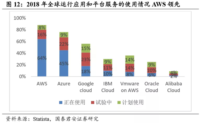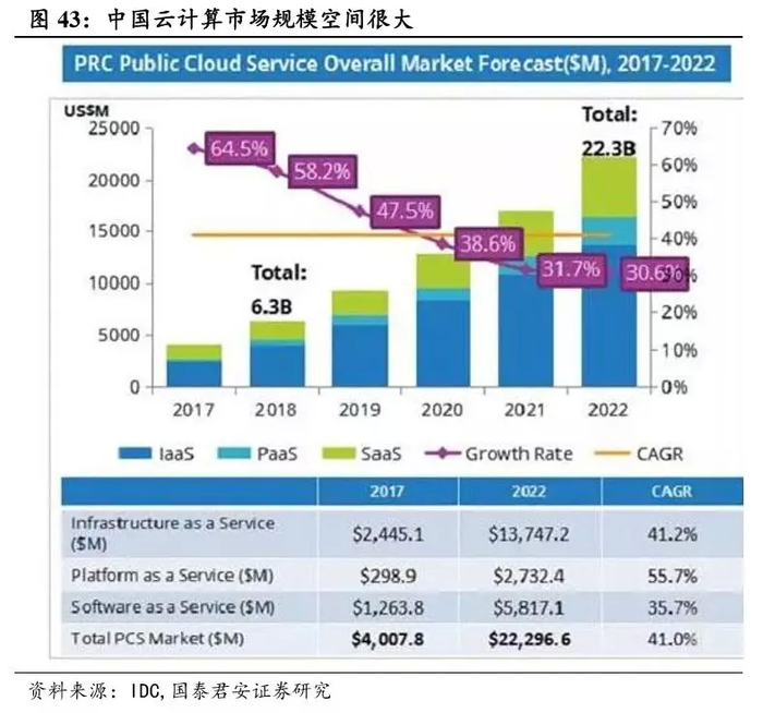 公有云未来市场空间广阔,AWS 抢占先发优势,市占率一骑绝尘。根据 Gartner 的数据,全球公有云服务市场预计将在 2019 年增长 17.33%, 至2062 亿美元,高于2018年的 1758 亿美元。根据研究和咨询公司的数据,2018 年市场将从2017年的1453 亿美元增长到 21%。基础设施即服务(IaaS)将成为市场增长最快的部分,预计2019年将增长 27.4%,达 到395亿美元,高于2018年的310亿美元。