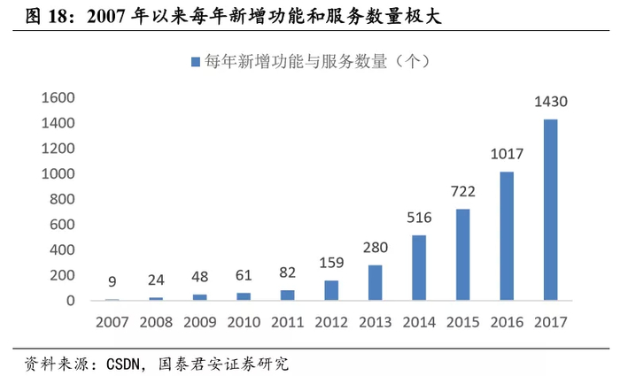 除了上述主要功能之外,AWS也在不断地进行着产品和服务的更新与拓展。2015年新增功能与服务 722 个,2016 年新增功能与服务 1017 个, 2017 年新增功能与服务1430 个。顺应当下云计算、大数据、物联网、 人工智能等新技术的发展趋势,亚马逊 AWS 几乎每天都会有新的功能 上线,如今 AWS 已经推出数千项新功能,可以帮助用户搭建各类新的 应用。