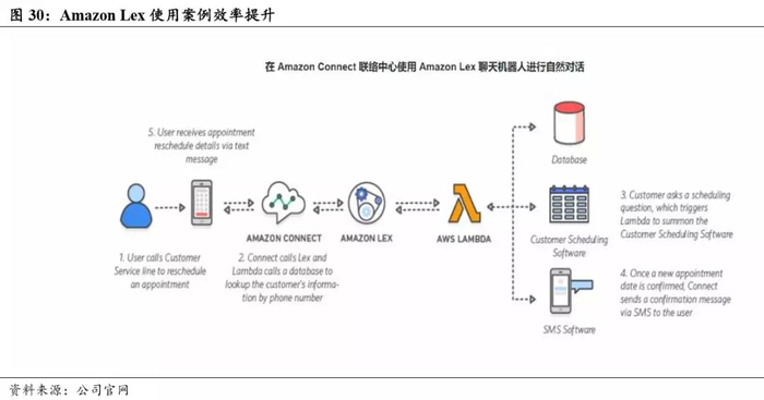 2016 年年底,继推出Amazon Machine Learning 之后,AWS又正式推出 了基于深度学习 MXNet 平台人工智能方面的三个云服务:支持 24 种语 言 47 种声音的文本到语音转换服务 Amazon Polly、基于深度学习的图 像和人脸识别服务 Amazon RekogniTIon 以及可编写自然人机交互的 Amazon Lex。