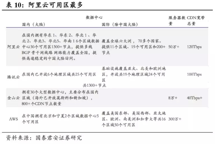 从基础设施来看,在国内,阿里云拥有 6 个区域数据中心30个可用区,服务器50余万台,带宽120Tbps,远超同行业主要竞争者。