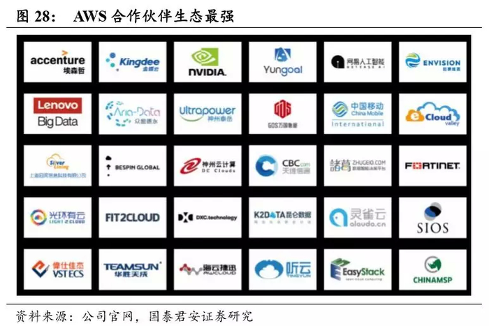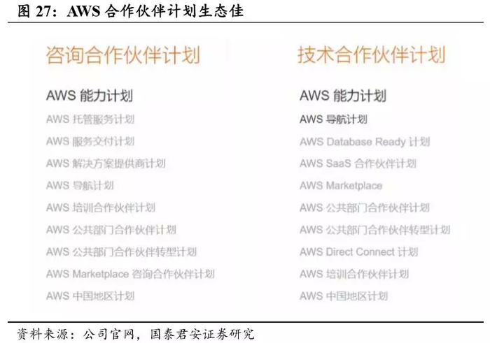 AWS 的另一大优势在于其构建了庞大的生态合作系统。AWS 合作伙伴网络 (APN) 是 AWS 2014 年推出的一项全球性合作伙伴计划。AWS 将帮助合作伙伴评估其云计算技能,帮助其制定云商业转型计划,最大化云应用的商业价值,合作伙伴通过 AWS 的支持将有机会在给最终客户提供 IT 规划、架构、集成与运维服务方面开拓新的商机,也可以把自身 的软件解决方案按照云服务的方式,以按需付费的方式交付给用户。