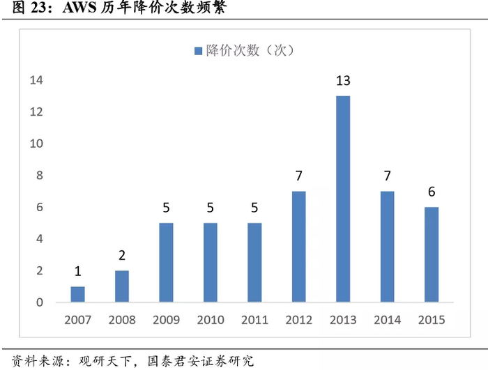 从产品价格来看,更多的基础设施以及更高的市占率形成了规模效应,带来更低的基础设施成本和更低的价格,吸引更多用户,已经形成良性循环。自 2006 年推出第一项服务以来,价格已经下降超过六十次,AWS 在保证利润的前提下规模进一步扩大、巩固了领先地位。2017 年 7 月, AWS 官方宣布完成第 62 次降价,而仅今年第二季度,AWS 整体收入同 比大增 49%,预计全年收入超过 240 亿美元,我们认为,AWS 的高降价频率并未影响盈利水平,甚至带来更多边际效用,AWS 价格仍有较大 的下调空间,在如今云厂商纷纷降价的情况,AWS 保持着游刃有余的强竞争力。