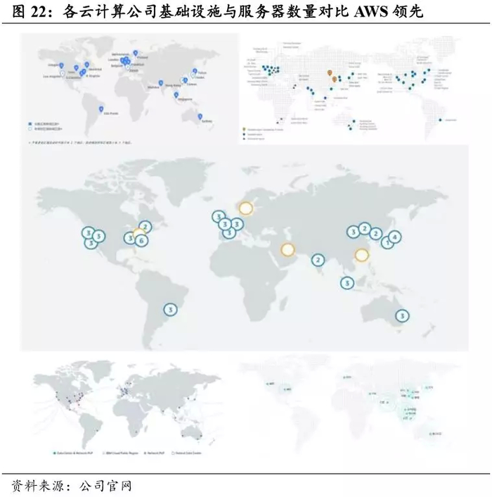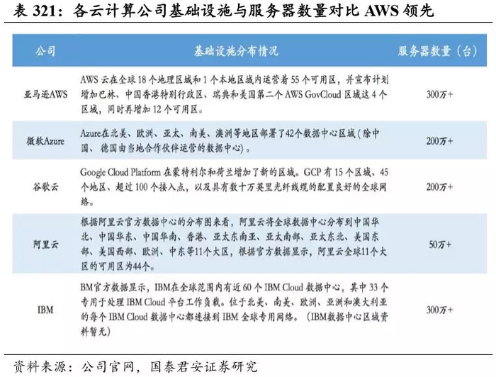从基础设施来看,亚马逊 AWS 的基础设施不论是从覆盖范围还是管理服务器数量上较其竞争对手都有显著优势。云计算基础设施主要有三个概念:区域(Region)、可用区(Availability Zone)和边缘节点(Edge Location)。每个区域间相互独立并由数个隔离的可用区组成。可用区为 一个数据中心群,包含 1~6 个 6 万+规模的超大数据中心。这些可用区通过延迟低、吞吐量高且冗余性高的网络连接在一起,可用区间距离通 常为 30~100 公里,以保证风火水电的隔离。通过这些可用区,AWS 客 户可以更加轻松且更有效地设计和操作应用程序和数据库。