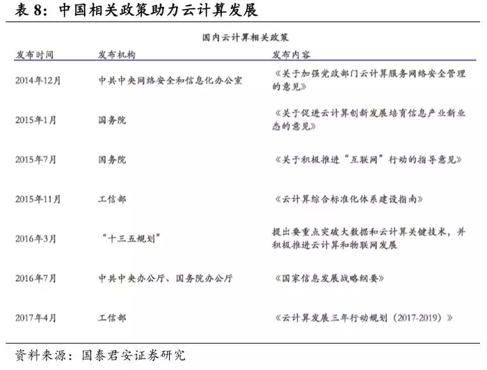 随着云计算在国内的认知度的逐渐提高,一些相关政策的部署,云计算在我国市场将覆盖更多行业。国家“十二五”、“十三五”规划都明确提出将云计算作为未来科技发展的重要领域,近几年支持云计算发展的相关政策密集出台。此外,各级部门明确提出政府部门、银行等金融机构业务逐步迁移至云端,意味着将为私有云厂商带来大量订单,近两年阿里云、腾讯云、运营商纷纷0元中标地方政务云,希望借此获得项目的运营权,从日后的数据经营中长期获利。
