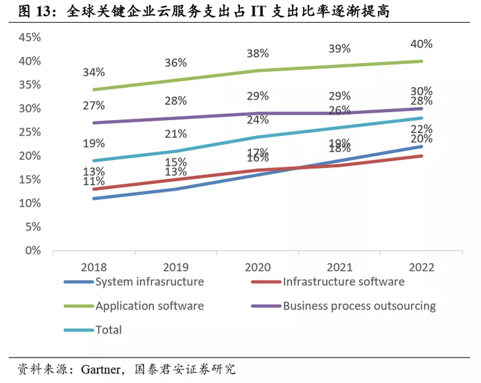 从市场空间来看,企业上云已成大趋势。根据 Gartner 预测,到2022年,全球超过1.3万亿美元的 IT 支出将直接或间接受到向云转变的影响。关 键企业 IT 市场中 28 %的支出将在 2022年之前转移到云端,高于2018 年的19 %。