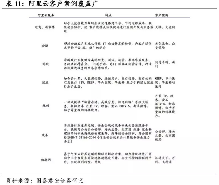 从客户类型来看,阿里云客户涉及范围广泛,其中,电商、金融、政务、医疗等非娱乐领域客户资源优势明显。不同于腾讯云和金山云的视频+游戏领域发力,阿里云客户资源逐渐向政务、金融、电商、医疗方向倾斜。金融和政务选择阿里云现象明显,反证阿里云安全技术水平过关。我们认为阿里 云依靠优秀的前期客户资源背书未来,有望继续实现对于传统领域以及长尾市场的高度渗透。
