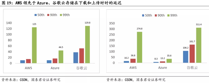 从产品性能看来,AWS 云存储提供最低延迟,擅长小文件的上传和下载。根据 CSDN 专业 IT 技术社区上的测试,在经过对 AWS 简单存 储服务(S3)、Azure 存储 和 Google Cloud 存储(GCS) 三家云存储性能的 测试后结果对比可以发现,在下载文件时,AWS 与 Azure 延迟相当,但 远低于谷歌云,吞吐量介于谷歌云与 Azure 之间;在上传文件时,AWS 的延迟与吞吐量情况均介于谷歌云与 Azure 之间。