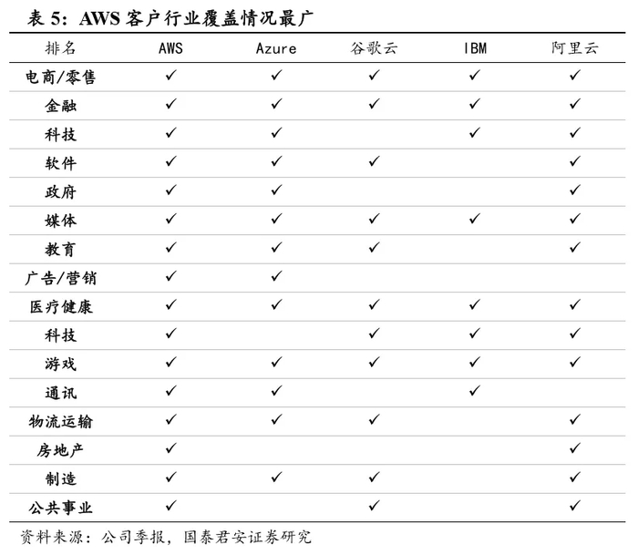 从客户行业来看,相比较其他云厂商,AWS 覆盖的行业更广,基本上实现了行业的全面覆盖。而从数据来看,Azure 以及阿里云还有部分缺口,相比较而言谷歌云及 IBM 行业覆盖面较小。在客户层面,AWS也是当无愧的行业龙头。