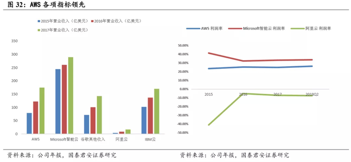 亚马逊引领云计算一路高歌,成为唯一盈利的行业巨无霸。从云计算的发展历程看,在谷歌、微软等竞争对手进入云计算领域之前,亚马逊云已经初具规模,抢占市场先机。对比亚马逊、微软、谷歌、阿里云和IBM的云业务相关营业收入,Microsoft 智能云营业收入中除 Azure 外,还包括多种服务器产品和企业服务等,谷歌其他收入中除云服务外还包括 APP 收入、媒体收入、硬件收入等,单就云服务营业收入来说,AWS 在多家龙头厂商中仍属于领先地位,且唯一实现盈利;在其他高利润率 产品的拉动下微软智能云营业收入及利润率较高,但 Azure 自身仍尚未 扭亏。阿里云作为国内云计算领航者,发展速度飞快,但仍处于前期投入阶段,尚未获得盈利。