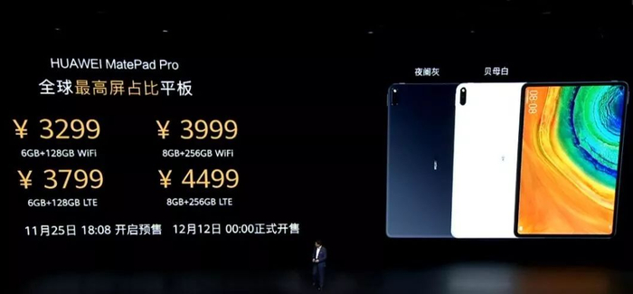 在今天的发布会上,华为发布一款平板产品MatePad Pro,售价3299元起。11月25日18点08分开始预售,12月12日正式开售。MatePad Pro 5G版明年一季度发布。