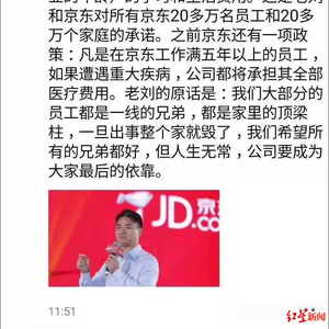 “这是老刘和京东对所有京东20多万名员工和20多万个家庭的承诺。”宋旸朋友圈截图显示,此前京东还有一项政策,即凡是在京东工作满5年以上的员工,如果遭遇重大疾病,公司都将承担其全部医疗费用。