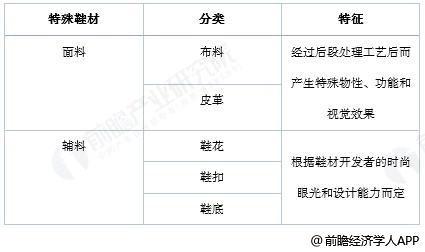 特殊鞋材一般是指不同于一般的,与常规鞋材在原材料、工艺、效果、用途等上面有明显不同的制鞋材料。一般可以分为面料和辅料。其主要分类如下表所示: