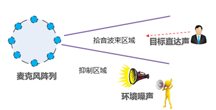 1)波束区域拾音方法有局限性。上面这一类语音增强技术大都是采用基于MSE的优化准则,从听觉感知上使得波束内语音更加清晰,波束外的背景噪音更小。但是听觉感知和识别率并不完全一致。而且这种方法在噪音内容也是语音内容的时候(例如电视和人在同一个方向时),性能会急剧下降。