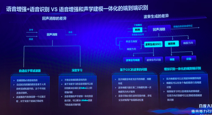 如前面提到,相对于百度智能音箱线上产品所采用的基于传统数字信号处理的前端增强模块和一个后端语音识别声学建模过程串联的方法,这种基于复数卷积神经网络的语音增强和声学建模一体化端到端建模技术,获得了错误率超过30%以上的降低。