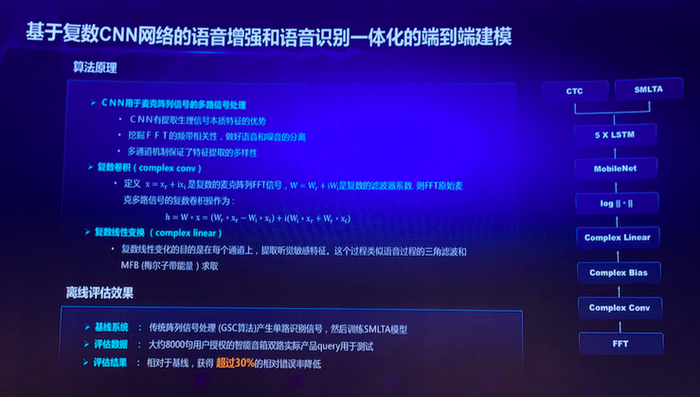 百度采用了类似的思想,即做“语音增强和语音声学建模一体化”的端到端建模,不过他们所采用的是“基于复数的卷积神经网络”。