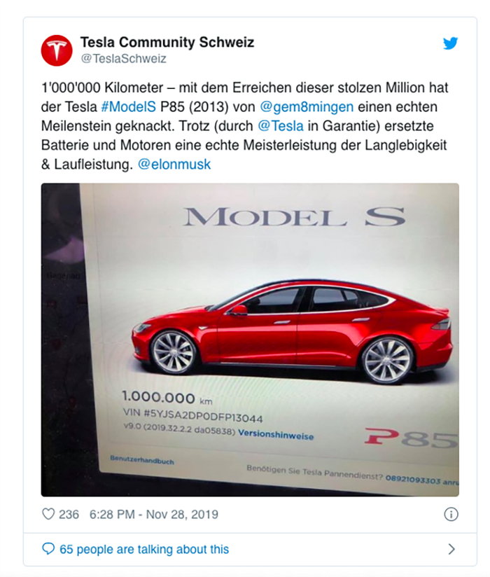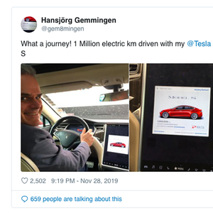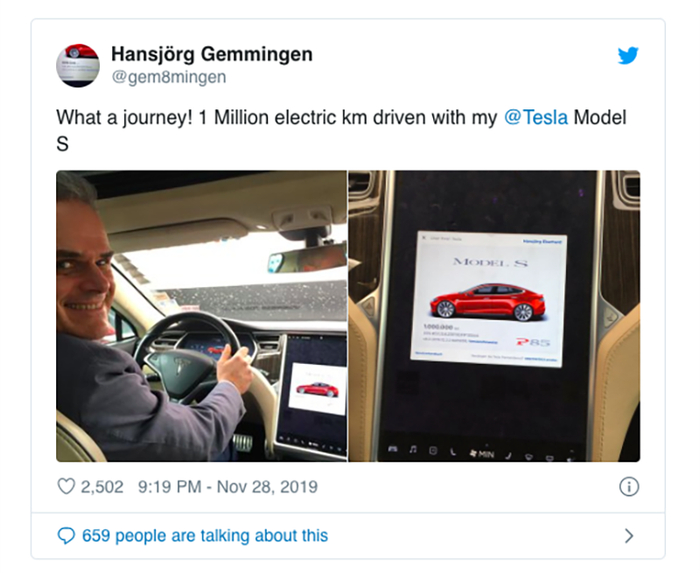 Hansjörg Gemmingen发推特,称“怎样的一段旅行!我的特斯拉Model S已经行驶了100万公里。”