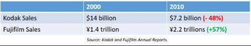 2000-2010年,胶片市场下降到不到10%,柯达的销售额下降了48%,而曾经60%的销售额来自胶片的富士却成功转型,并在这十年内,收入增长了57%。