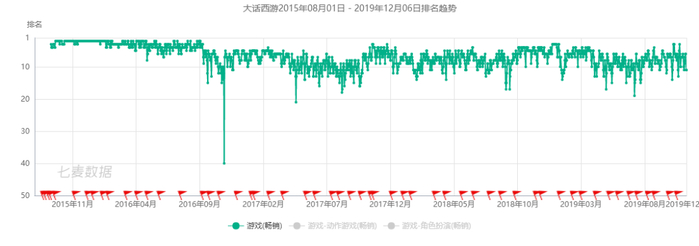 不过,话说回来,游戏产品的衰落并不是抛物线式的下落,而是断崖式的跌落。我们以《大话西游》(手游)的数据为参考。