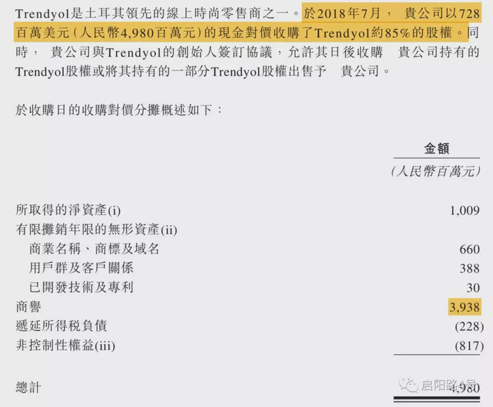 招股书中写到,「此次收购产生的商誉来自Trendyol与阿里的业务整合、汇聚的人才及其在电子商务方面的知识及经验带来的协同效应。」