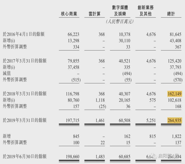 阿里在大手笔收购时,也产生了大量的商誉。高额的商誉为日后带来潜在隐患。