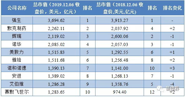 2019年,全球医药企业前十名的名单出现了一些变化。就总市值而言,与去年同期相比,诺和诺德(NVO.US)排名上升三位,艾伯维(ABBV.US)下降四位,跌至第九。