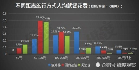 据调查,国内游单次人均就餐花费在50-100元之间占比最大,49.57%国内远途游人群和47.44%周边游人群就餐消费在这一区间内,几乎90%左右的国内游的人群,在就餐消费上都低于200元。而境外游单次人均就餐花费则主要集中在50-300元之间,其中33.33%的人群就餐花费在200-300元之间,占比最大,花费在100-200元、50-100元之间的人群占比分别为27.78%、22.22%。