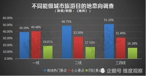 相对而言,传统的热门景点,仍是大多数人在进行旅行计划时优先选择的目的地,这一趋势在二三四线城市中表现的更为明显。而在一线城市,目的地选择去往小众景点的人群占比40.48%,以1.19%的微弱优势,压倒传统热门景点(39.29%)。