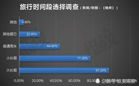 受访者中,97.2%的人选择在“十一国庆”“春节”长假进行旅行计划,而选择在小长假(“劳动节”、“清明节”、“端午节”、“中秋节”等)旅行的人数占比77.2%。