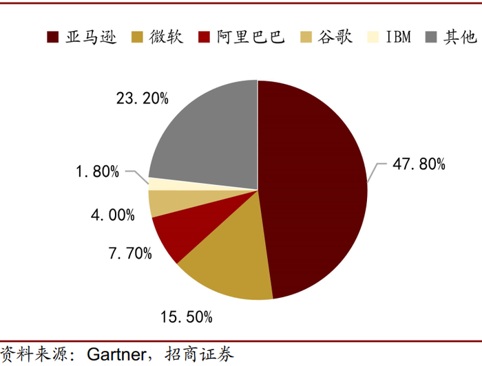 由于基础设施所需的巨大资本开支和行业规模效应等影响,IaaS 的市场集中度非常高。2018 年,上述五家 IaaS 巨头公司的市场份额占比已超过总市场的四分之三,其中仅亚马逊就占总市场份额的 47.8%,目前,各大厂商对 IaaS 的投资仍没有放缓脚步。