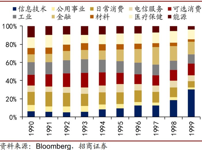 资本市场对此反应激烈,带来了科技股大牛市。1990 年初至 1999 年末,纳斯达克指数由 459.33 点上涨至 4069.31,涨幅达 785.92%。信息技术行业总市值占比也由 6.48%提升至 30.2%。