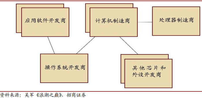 第一阶段以 IBM PC 出现为起点,计算机行业开始逐步由硬件、 软件、 服务一体化转向分工合作,在此期间,Intel 处理器以及微软的 Windows系统得以形成垄断。