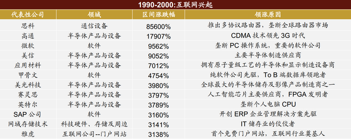 这个阶段,移动通信技术革命以及云计算兴起背景下,出现了类似于互联网大爆发时代下的景象,即大部分相关领域的龙头科技公司涨幅均超过了 5 倍。