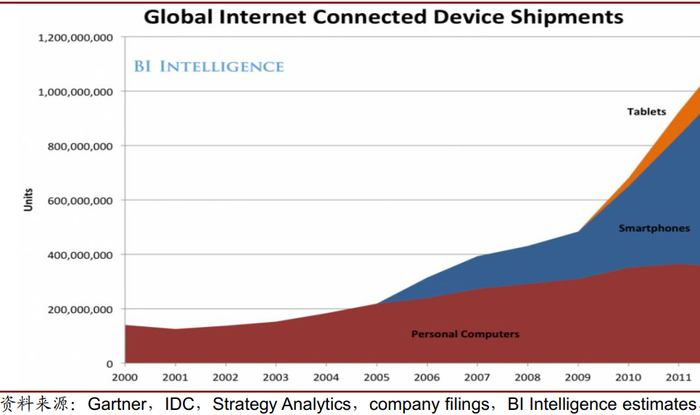 进入 2G 时代后,移动通信取得了非常大的进步。从联网设备的出货量可以看到,2005-2009 年期间,智能手机不断增长,但是增速较低,移动互联网尚处于萌芽阶段。