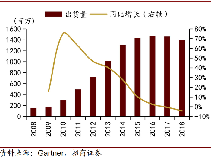 2010 年智能手机出货量同比增长 75.62%,比去年同期增长近 60%。此后几年间,各类智能手机品牌像雨后春笋般出现在手机市场,以华为、小米、OPPO、Vivo 为代表的国产智能手机逐渐在世界市场中占有了一席之地。