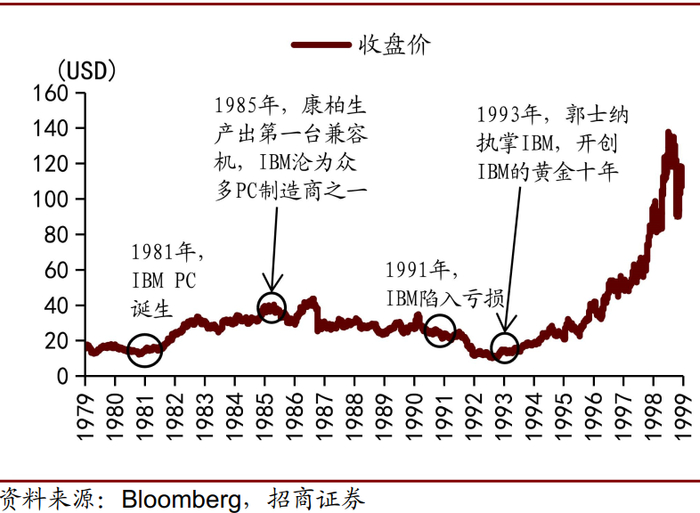 兼容机挤压 IBM 个人电脑业务利润,IBM 转型。1993 年,郭士纳临危受命,出任 IBM 的 CEO,将 IBM 重新定位为技术性服务公司,为企业提供问题解决方案。从 1993 年下半年起,IBM 的业绩突飞猛进,走出困境,股价也开始大幅上涨。