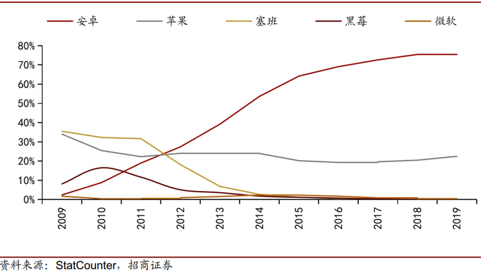 安卓在推出短短三年后就超越了昔日霸主塞班系统和黑马苹果系统,市场份额连续五年同比增速超 30%。目前,安卓系统已占总市场的 75.57%,苹果系统的市场份额保持在 20%左右。