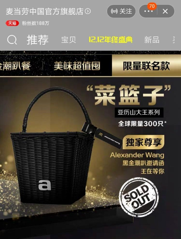 而在中国市场,麦当劳除了通过开心乐园套餐赠送《冰雪奇缘2》玩具,不久前还试水了一把“卖包”。12月7日,麦当劳在微博上宣布与华裔设计师亚历山大·王(AlexanderWang)联名推出了限量款包黑金篮子和黑金M手袋,其中形似“菜篮子”的包售价更是高达5888元,另一个则形似“汉堡袋”的纸袋,售价也达到了99元。12月10日在天猫发售后,300个黑金菜篮子在1秒内售罄,3万个汉堡袋被抢光。由于太拼手速,微博上有众多粉丝评论说抢不到,其号召力可见一斑。