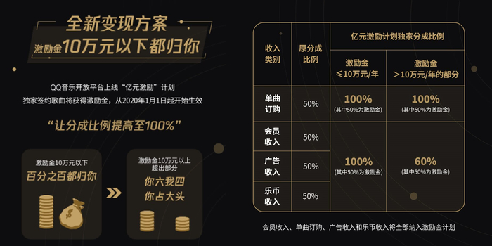 今天,QQ音乐开放平台上线全新变现方案:入驻音乐人签约独家歌曲即可获得激励金,激励金在10万元及以下的都会全部给到入驻音乐人,实现分成比例大幅提升。总收入在20万元以下的,平台给予的分成比例最高可提升至100%,同时对于超出部分,平台也将给予音乐人更多分成。