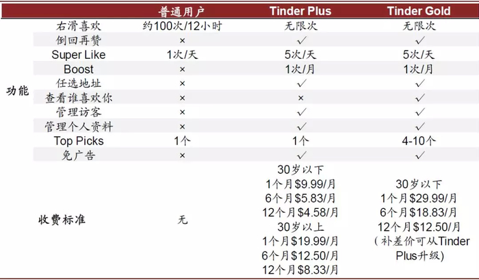 2015年3月,Tinder首次推出付费订阅服务Tinder Plus,Tinder Plus赋予用户在APP中一些特权,进而提升用户的使用体验,具体的新权利包括让用户拥有无限次数的右滑喜欢(Unlimited Likes)、反悔再赞(Rewind)、任选定位(Passport)等。