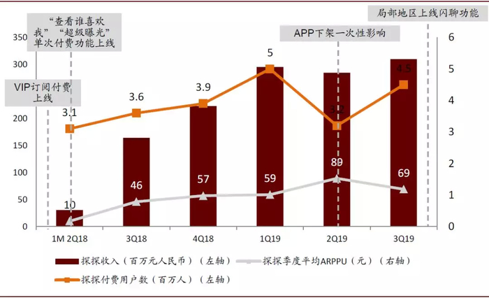 自2018年与陌陌并表后,探探的收入、付费用户数和季均ARPPU均稳步上升。同时,值得注意的是探探的主要收费功能,例如VIP的订阅服务和“查看谁喜欢我”和“超级曝光”等单次付费功能上线时间均在2018年上半年,这之后并没有全量上线新的付费功能,而与此同时,探探的收入、付费用户数仍能维持稳定的增长。在用户活跃度上,2019年4月底下架前,根据Questmobile数据,探探的月活数最高曾达到3300万,相较于全国约2.4亿的单身人口,渗透率约为14%,在竞品缺位的情况下,用户规模仍有很大的增长空间。