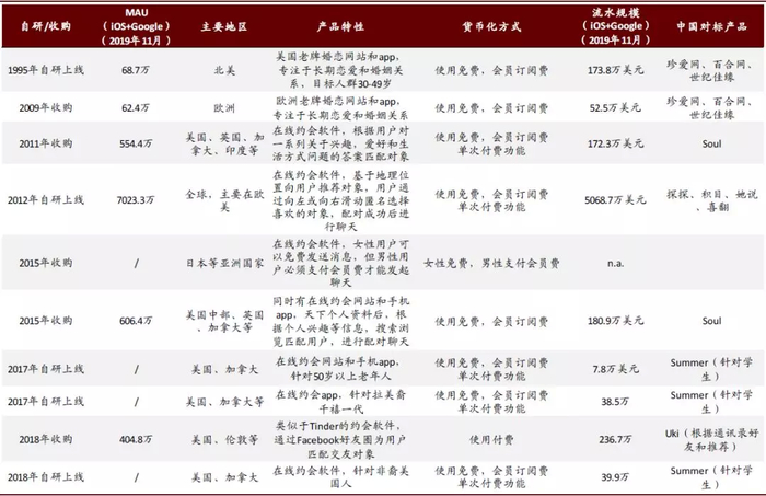 在线约会市场是一个在用户和地域都有多样性的市场。在用户上,针对用户不同的年龄和不同的需求,在线约会交友市场又可以细分为较为随意的在线约会、目的严肃的在线婚恋和针对不同年龄段用户的社交产品等细分;在地域上,美国欧洲是较为成熟的在线约会市场,亚洲也是增长较快的新兴市场,针对不同地域市场的特性和文化,也需要有不同类型的在线约会社交产品。因此,自2009年起,在当时公司的主力产品Match取得稳定规模之后,公司开始采用多品牌战略,不断内部孵化或收购新的在线约会品牌,旨在覆盖不同的细分市场,形成全面的产品矩阵。