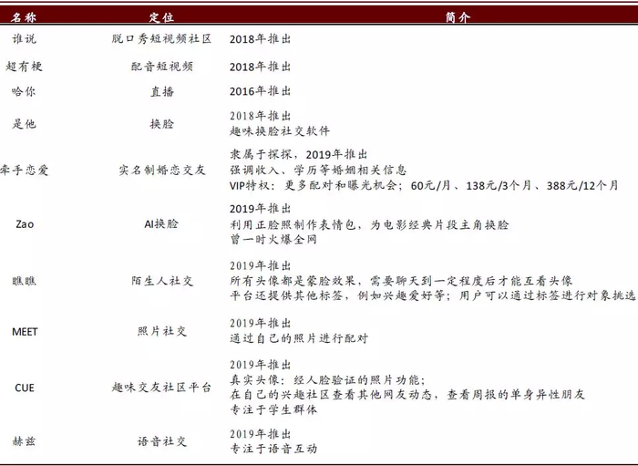 在核心产品之外,与Match一样,陌陌和探探也在积极探索新的产品方向。陌陌通过猫咖,陆续推出了近6款社交产品,包括瞧瞧、MEET、CUE等和之前突然爆红的“AI换脸”APP Zao,都是从不同的角度切入社交娱乐领域的产品。探探也推出了另一款更关注婚恋的产品牵手恋爱,旨在拓宽在社交领域的影响力。
