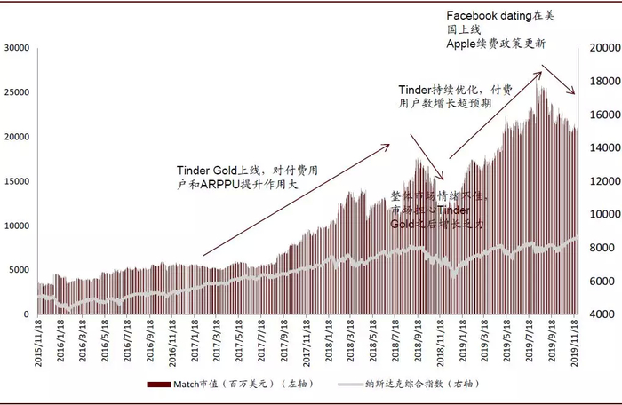 图表: Match市值2年内翻约5倍(vs纳斯达克综合指数)