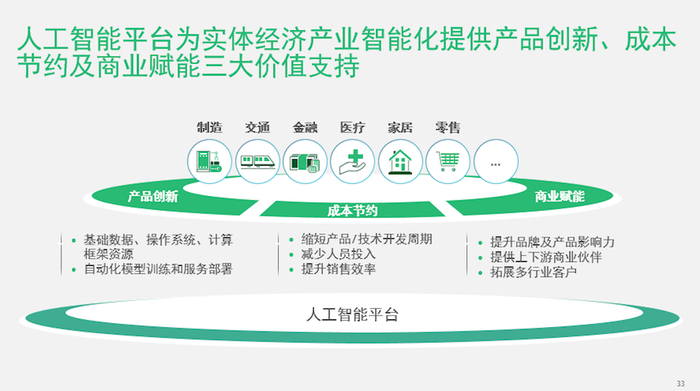 人工智能平台能够为实体经济产业智能化提供产品创新、成本节约及商业赋能三大价值支持。无论是无人驾驶领域还是语音交互领域,开放平台的出现确实都有效推动了行业发展。