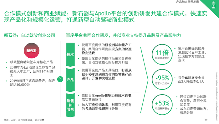 以新石器为例,通过与Apollo开放平台的合作,其技术方案迭代提速了11倍,每台车所需安全员由2人降至0.1人,节省人力成本95%,此外通过与百度平台合作联合传播,其品牌知名度提升了53%。新石器与Apollo平台创新研发共建的合作模式,能够快速实现产品化和规模化运营,打通新型自动驾驶商业模式。这使得新石器在今年5月正式启动量产后,年产能达到10000台。