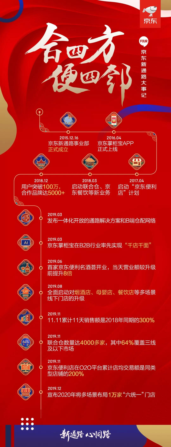 2019年的12月16日,京东新通路在成立四周年之际宣布2020年将多场景布局1万家“六统一”门店。标准化输出,规模化复制,标志着新通路的模式相对成熟,接下来将进入一个新的发展阶段。